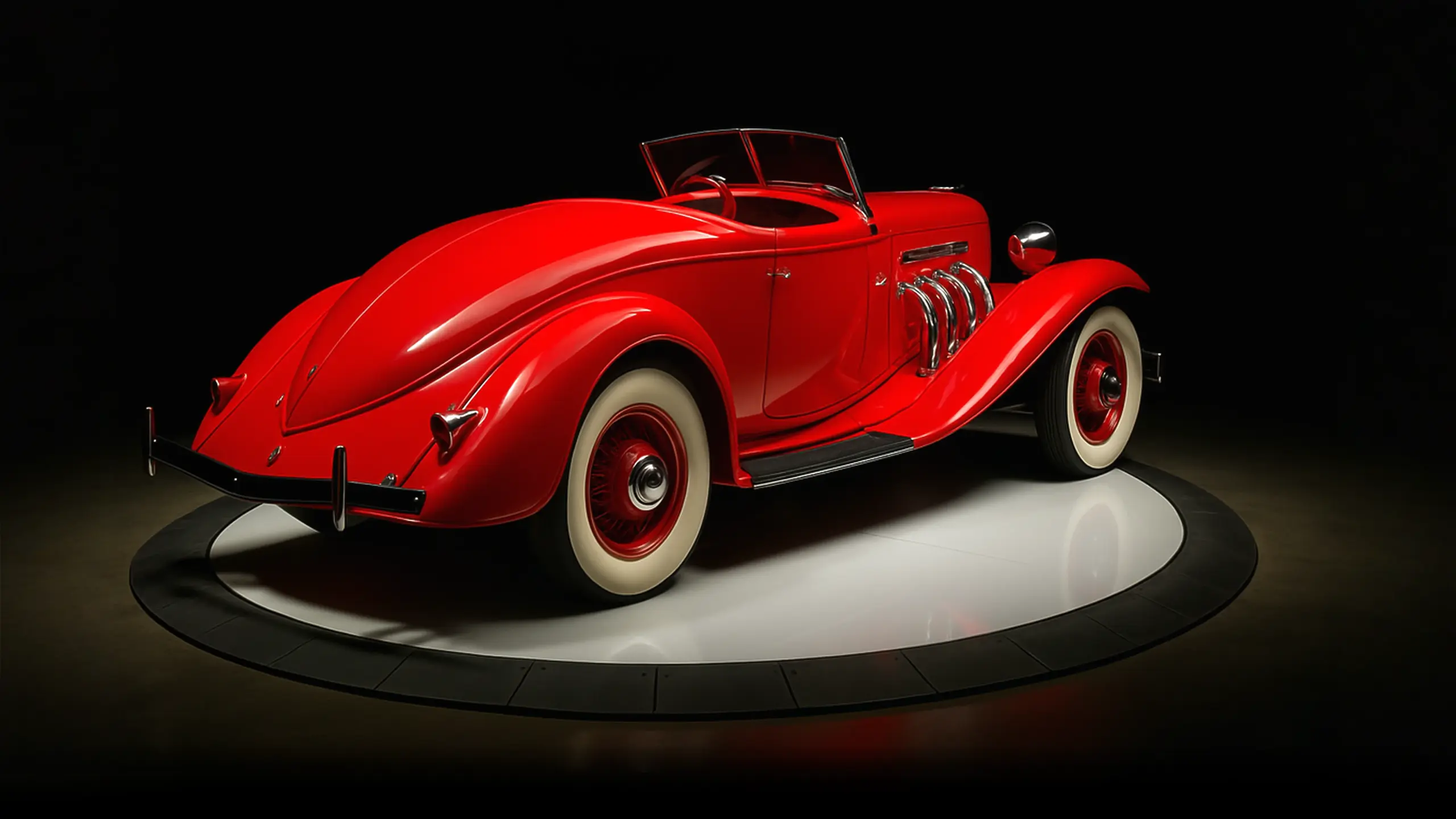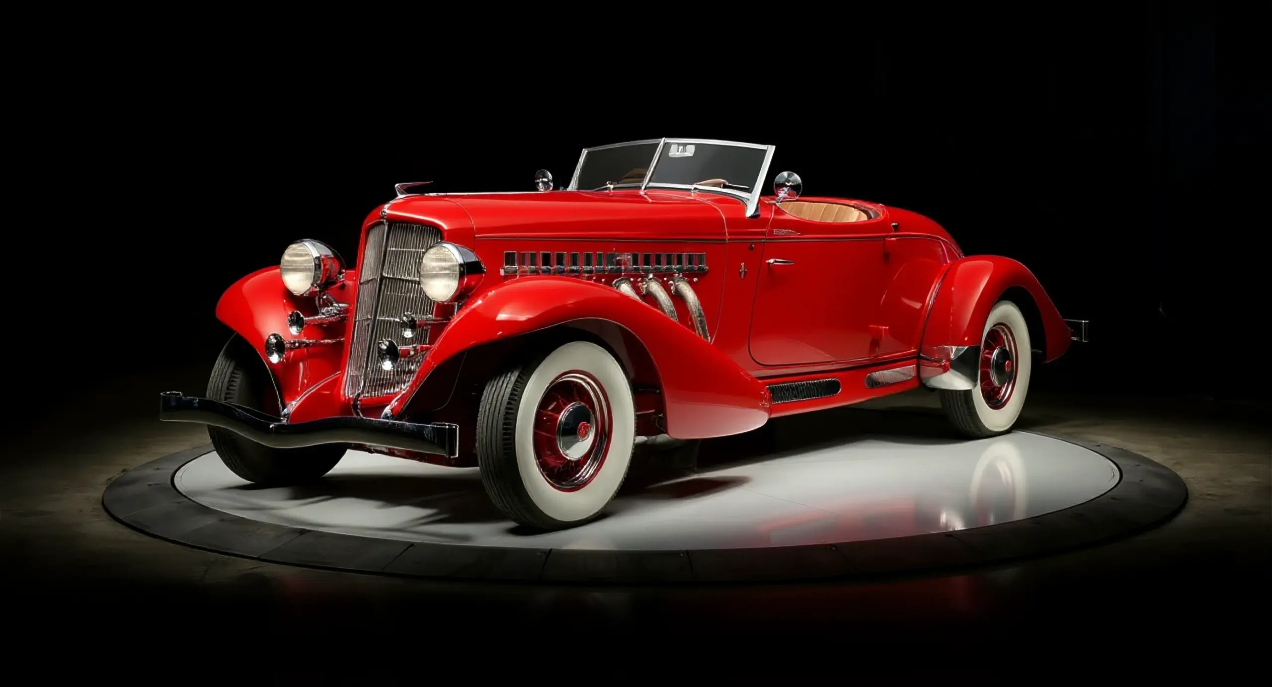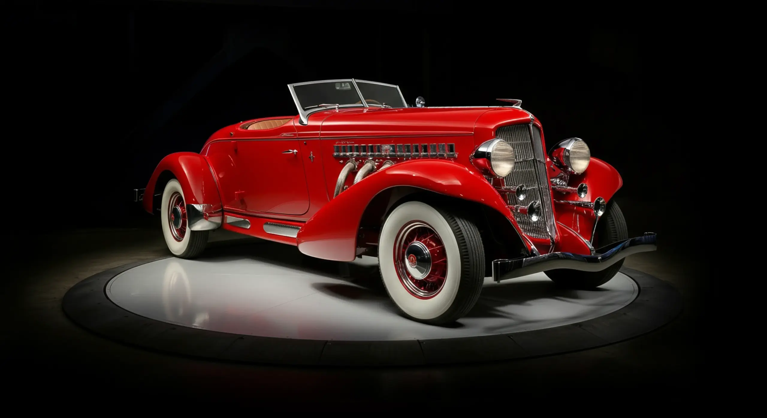 A streamlined American classic with art deco influences, famous for its boattail rear and chrome side exhaust pipes.